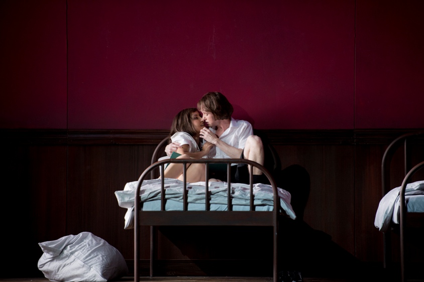 turn_of_the_screw_191Eine Sache, die in der Inszenierung hervorsticht, ist die erhöhte Sexualität der Charaktere. Was im Quelltext angedeutet wird, ist ein integraler Teil der Aufführung. Auf einer bestimmten Art und Weise könnte ja »The Turn of the Screw« auch bedeuten, dass sich die ganze Welt nur um das Eine dreht. Möglicherweise haben Claus Guth (Inszenierung) und Yvonne Gebauer (Dramaturgie) eben diesen Gedanken im Hinterkopf gehabt und somit wuchert Erotik regelrecht auf der Bühne. Sei es die pure Begierde einer verliebten Frau, seien es unerwartete homosexuelle Momente zwischen zwei Damen oder sei es das unangenehme inzestuöse Verhältnis zweier Geschwister. Die Inszenierung ist voll mit solchen Szenen und Anspielungen, die man nicht so leicht abschütteln kann.