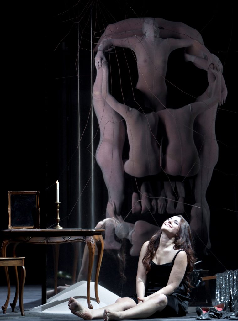 Dabei möchte ich sagen, dass die Traviata-Darstellerin – Ailyn Pérez – ausgezeichnet war und zumindest ein bischen die Vorstellung gerettet hat. Alfredo (Abdellah Lasri) war etwas unbeholfen, „teddybärartig“, altjung, mit Mängeln in der Gesangtechnik, mit Charisma gleich Null – ich konnte ihm einfach kein einziges Wort glauben (ein Jüngling ohne Erfahrung?? Haha…). Germont wurde von einem Sänger in meinem Alter (Mitte 40, Simone Piazzola) dargestellt – schöne Stimme, aber so tölpelhaft und hölzern, mit absolut katastrofaler Gestik, so dass er seine ganze Leistung abgewertet hat. Er hat sich zwar bemüht dramatisch zu wirken, es fehlte jedoch an väterlichen Gefühlen dabei. Wie gesagt, die Gesten und krampfhafte Körperhaltung haben uns die ganze Zeit an den Schatten von Nosferatu aus dem deutschen Stummfilm erinnert; insbesondere die krampfhaft gestrecken Hände mit gespreizten Fingern – in solcher Pose konnte er vielleicht 5 Minuten verharren… Das absolute Top des Regie-Albtraums war die Idee, für einen ganzen Akt nicht nur Alfredo, sonder auch das gesamte Orchester als Hintergrund der Szene „einzusetzen“ – dies hat zwar überzeugend die Töne des entfernten Operhauses dargestellt (siehe Libretto), aber die schönsten Soli auf der Szene haben dadurch den Eindruck erweckt, sie werden a capella gesungen (statt der vollen und reichen Verdi-Arrangements) – also ganz flach, was bei der unzureichenden Technik von Alfredo (der sehr oft unterm Ton lag und und in tieferen Lagen sehr unsicher wirkte) so klang, als wäre die Oper von einem Amateurchor einstudiert. Und noch eins hat die ganze Inszenierung völlig abgewertet – und zwar die Pianissima. Ja, es ist ohne Zweifel bewundernswert, welche Pianissima die Violetta geschafft hat und es bezeugt ihre wunderbare Technik. Aber an manchen Stellen hat sie so leise gesungen, dass ihr Gesang auch a capella völlig untergangen ist. Das war nicht ihre Schuld. Es war eindeutig von der Regie so gedacht – jedocht schlecht gedacht.