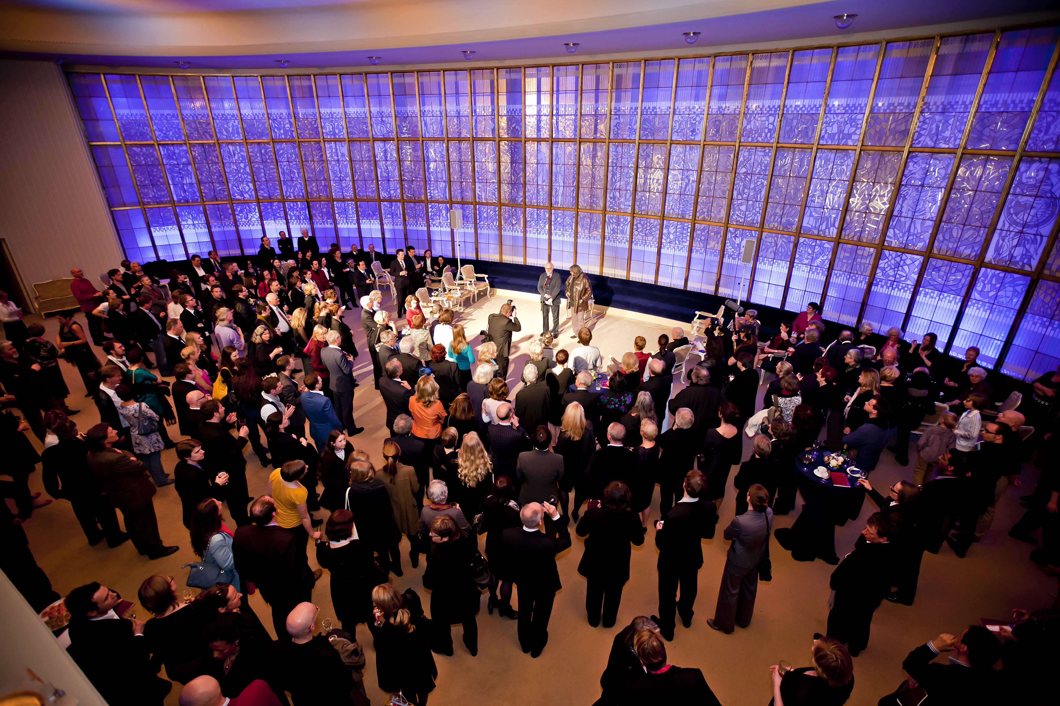 Orte zum Verweilen, für jetzt und für demnächst: das Gläserne Foyer bei einer Premierenfeier …